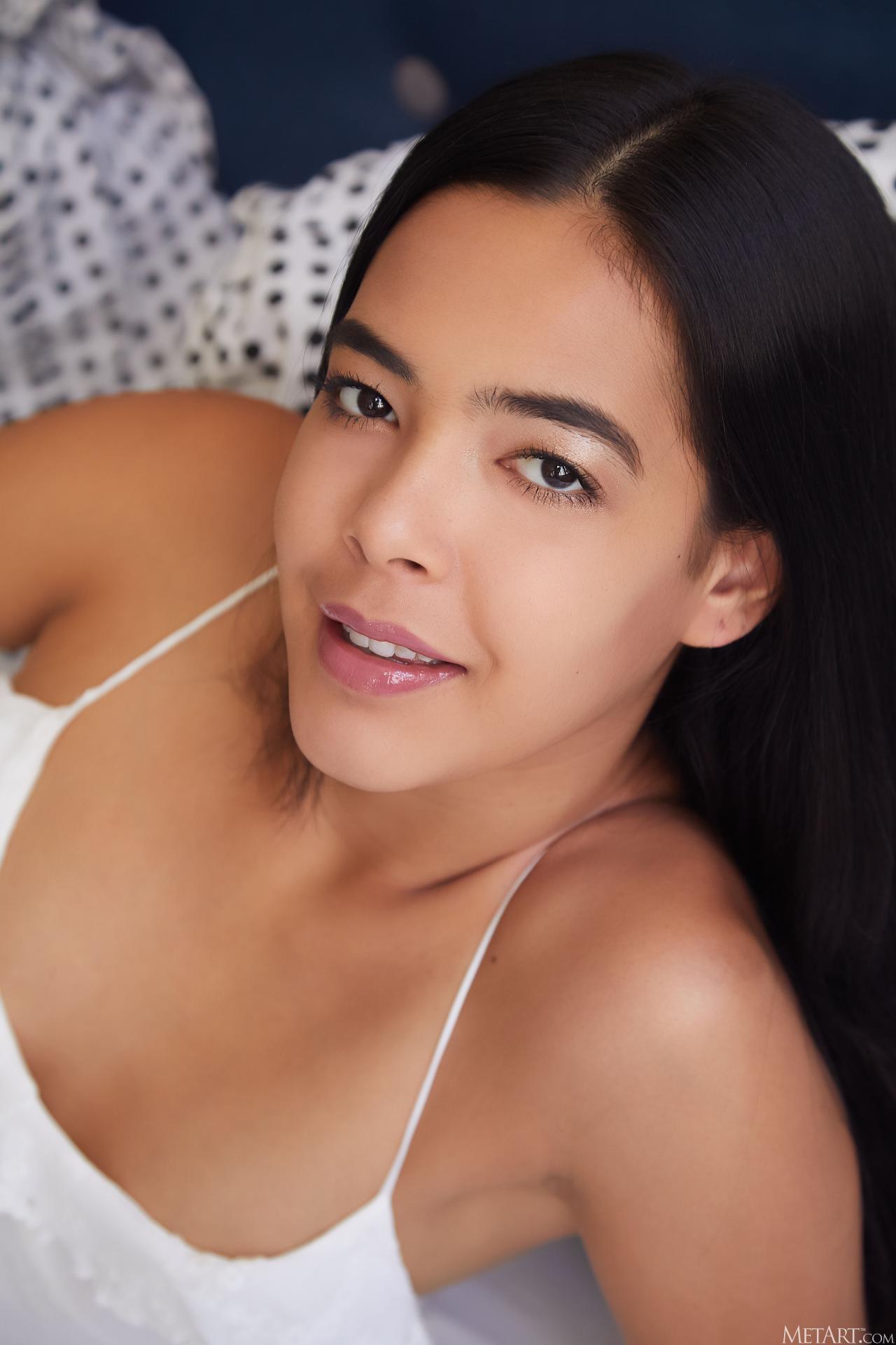 Radiant Colombian beauty Kubera Fortuna carries the softness of a blissful reverie into wakefulness. The curvaceous Latina brunette throws back the bedcovers, the morning light making her caramel skin glow against her thigh-skimming white chemise and matching panties. She stretches languidly, her sultry smile growing spicy, as if the memory of her dream still lingers sweetly in the air.